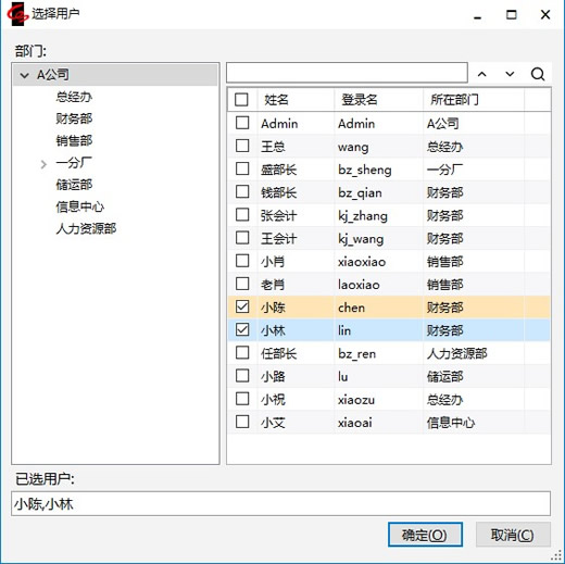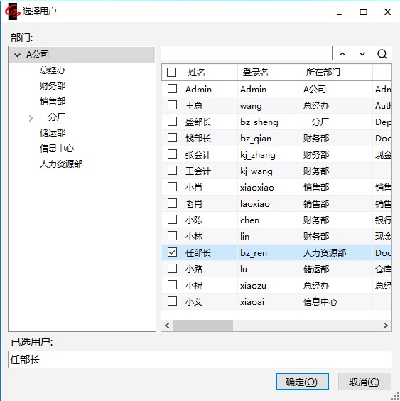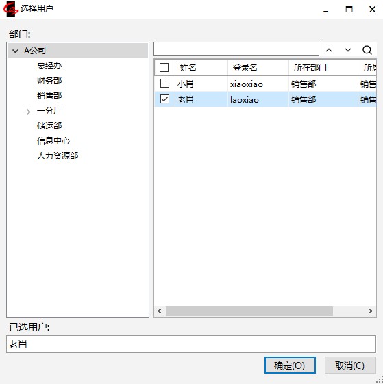 在弹出窗口中选择将要更新权限的用户,【确定】。则将肖部长的模板、自定义查询、栏目、导航图等中“按用户”设置的权限,复制给我们选择的用户(复制的权限不是覆盖,只做新增不做修改)。