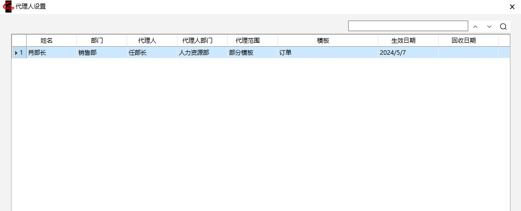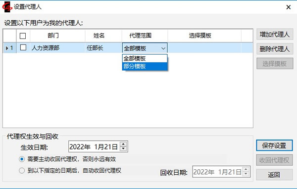 3.点击【确定】回到“设置代理人”窗口,列表中显示刚刚选择的代理人。可以设置代理人的代理范围。默认是全部模板。如果选择“部分模板”,则在“选择模板”栏目还要选择具体的模板、自定义查询名称。比如,肖部长只希望任部长代理自己进行订单的审批,因为这个工作不能耽误,但是其它的工作还是希望自己回来之后亲自完成,则可以选择代理范围为“部分模板”,在“选择模板”栏选择“订单”。