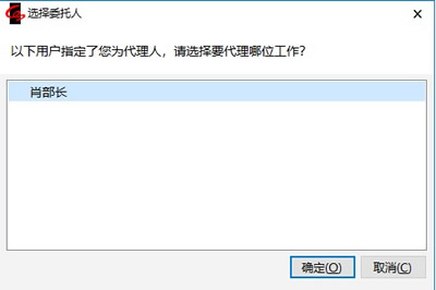 - 点击【退出】-【进入代理】菜单,这时会弹出一个“选择委托人”窗口,勾选“肖部长”(任部长是肖部长的代理人,肖部长是任部长的委托人),点击【确定】,现在任部长是作为肖部长的代理人登录到系统。这里我们要说明的是,任部长登录时用的是自己的账户名和口令,并不是肖部长的账户名和口令。肖部长只需要设置代理人,却不需要将自己的账户名和口令告知代理人。