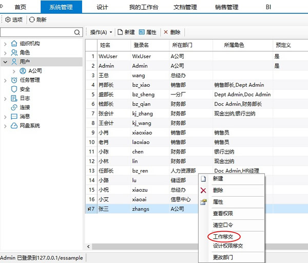 用系统管理员或者张三所在部门的部门级管理员登录客户端-【系统管理】栏目,鼠标单击“用户”节点,此时,右边就会列出用户的详细信息。鼠标右击“张三”,在弹出的菜单中选择【工作移交】。