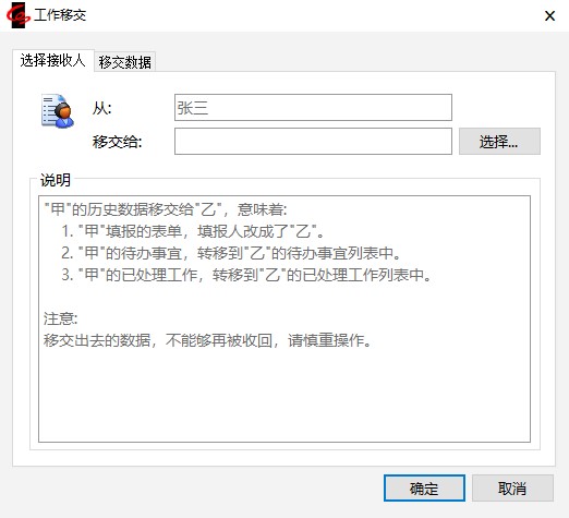 弹出选择用户窗口,该窗口列出的用户是和张三具有相同角色的人。选择要交接给哪些用户,点【确定】。