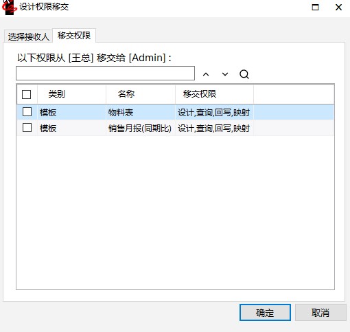 点击【移交权限】选项卡可选择需要移交的部分模板、查询、表或视图。