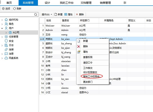 选中用户“肖部长”右键,点击【复制工作权限给……】按钮。