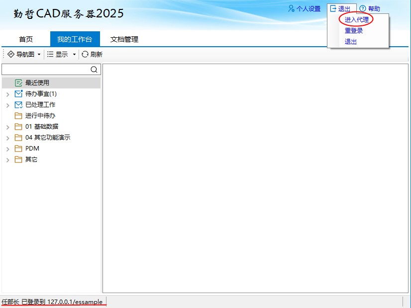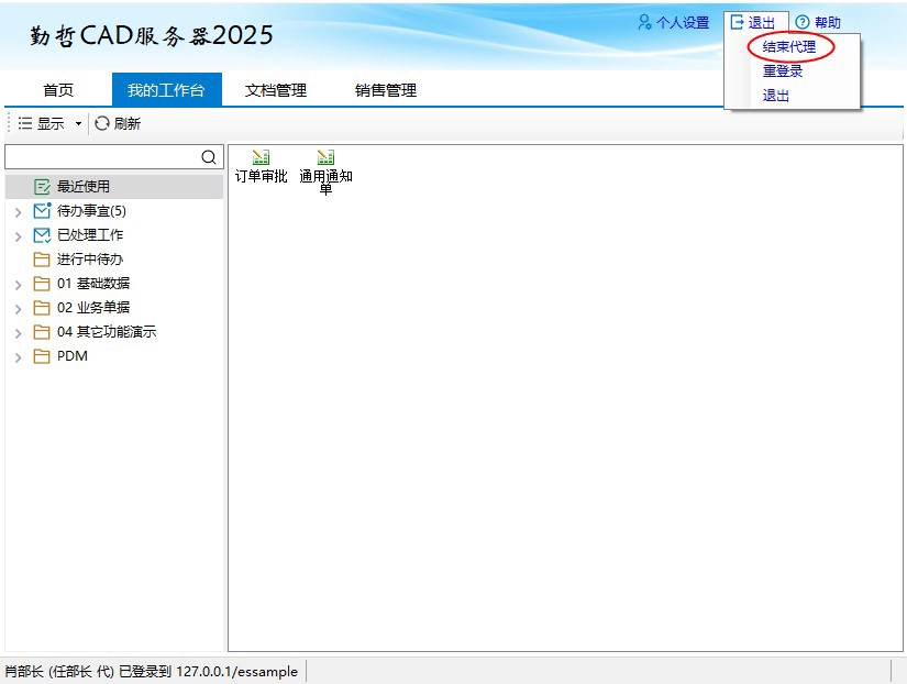 - 代理登录后,我的工作台上出现的是肖部长的待办事宜以及模板名称。点击【退出】-【结束代理】可退出代理。
