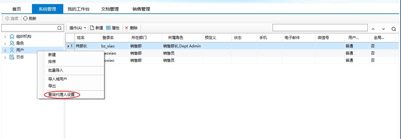 肖部长(部门管理员)登录,选中【用户】右键,点击“查询代理人设置”菜单。