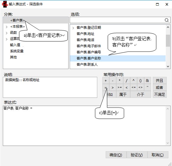 b)双击选项列表中的“客户表.客户名称”,使之出现于下方的表达式文本框