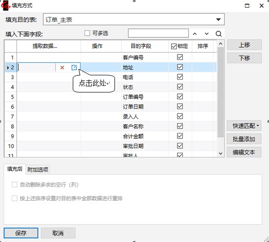 9.点击【填充方式】,出现“定义填充方式”窗口,填充数据表选择“订单_主表”,点击“地址”所在行的第一列编辑图标。