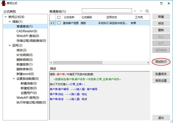 定义提数公式后,可如下图:选中普通查询,点击【测试执行】按钮,查看提数公式执行结果。
