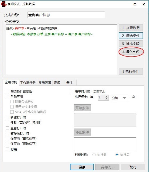 4.弹出“表间公式-提取数据”窗口,在公式名称处输入“查询客户信息”,应用方式选择“筛选条件改变后”,如下图。