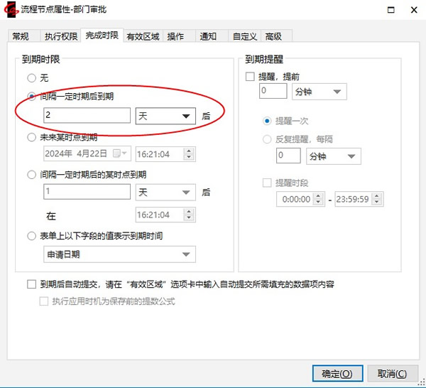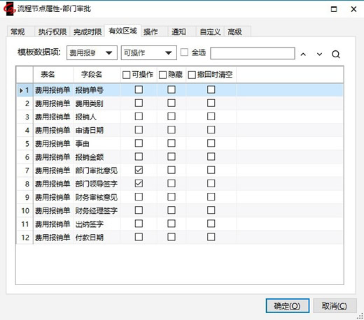3.切换到“有效区域”标签页,选中“部门审批意见”、“部门领导签字”,如下图: