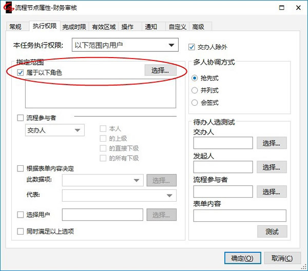 建立新任务“财务审核”,有效区域选择“财务审核意见”、“财务经理签字”,执行权限选择如下: