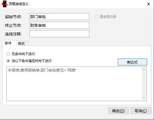 - 单击【流向】按钮,鼠标移到画板上,鼠标形状变成一个向上的箭头。单击一下“申请报销”任务图形,再单击一下“部门审批”任务图形,弹出“流程连线定义”对话框,如下图所示: