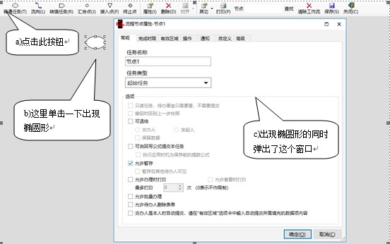 - 点击【普通任务】按钮,然后鼠标移到深灰色的画图区域,鼠标的图形变成十字,在画图区域的任意位置单击,出现一个椭圆形,并且弹出“流程任务定义”窗口。