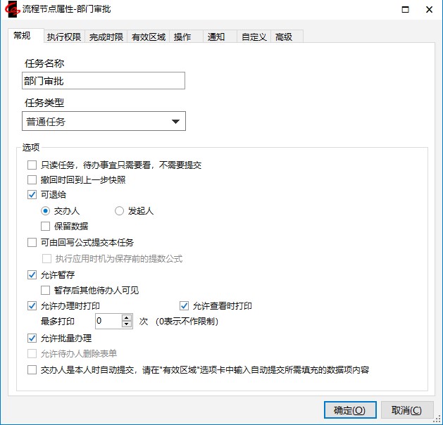 - 任务名称输入“部门审批”,勾选“可退给”并选择“交办人”,如下图: